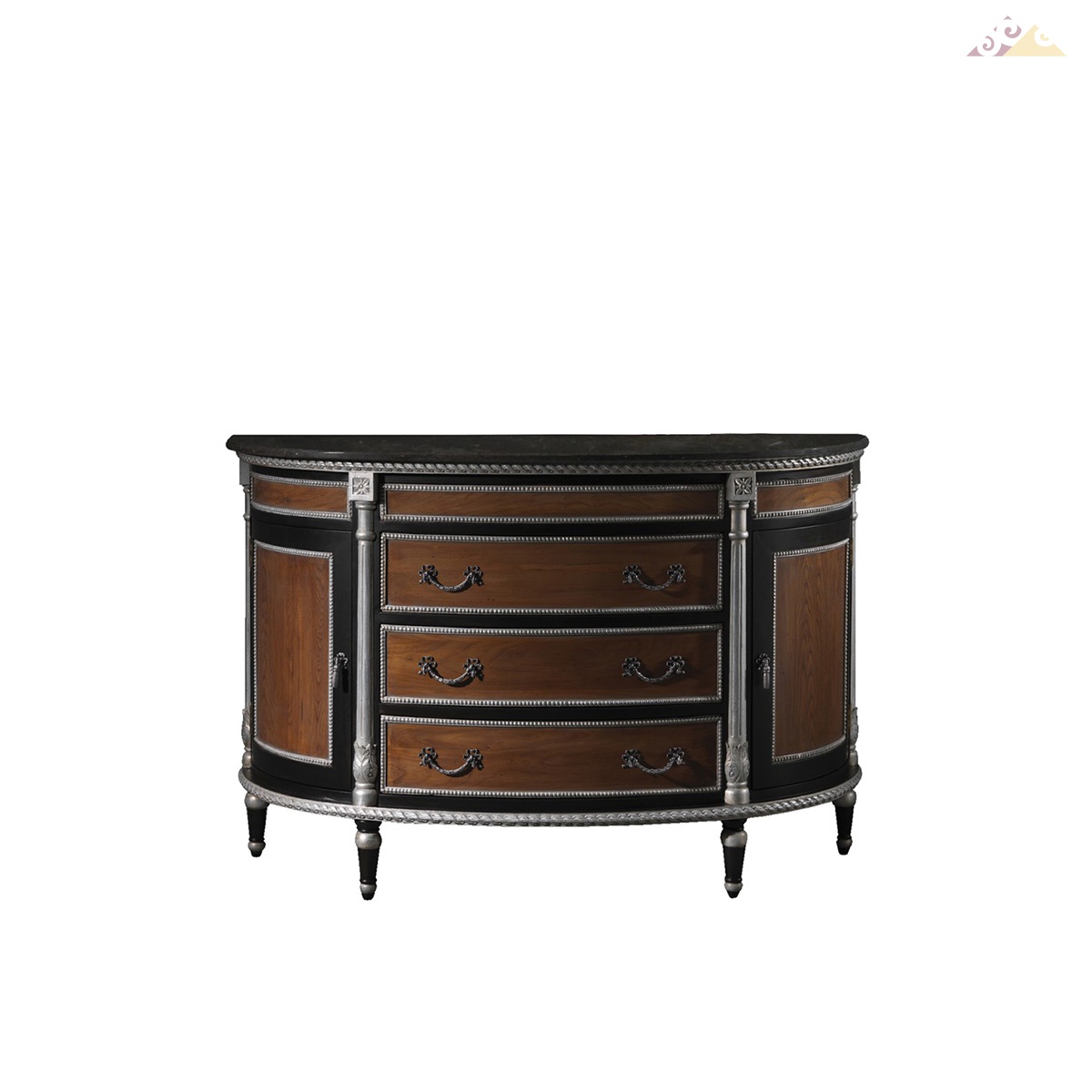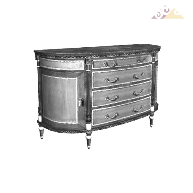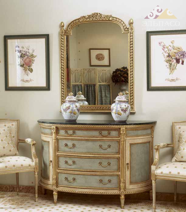 Полукруглый комод с распашными дверцами и выдвижными ящиками на фигурных ножках. Модель выполнена из массива дерева тонированного в бело-бирюзовый оттенок. Столешница изготовлена из полированного мрамора. Идеальный вариант безукоризненно выполненной дизайнерской мебели. Цветовая палитра согласно каталогу компании.