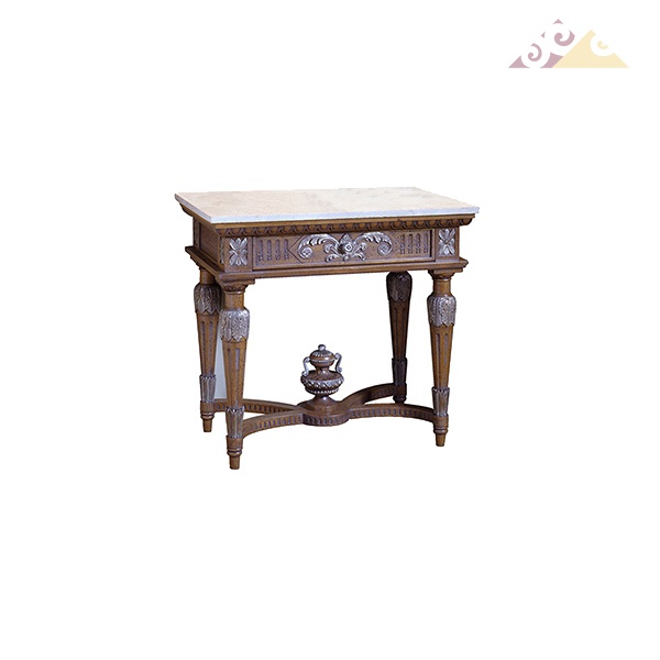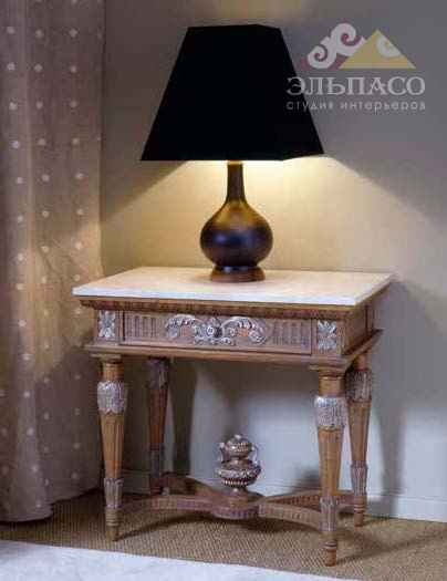 Стильный столик для гостиной на ажурных ножках с выдвижным ящиком. Модель выполнена из массива резного дерева тонированного в песочно-серебряный оттенок и украшена резьбой с цветочными мотивами и декоративными резными завитками. Столешница изготовлена из полированного белого мрамора. Преобразит и облагородит любой интерьер.