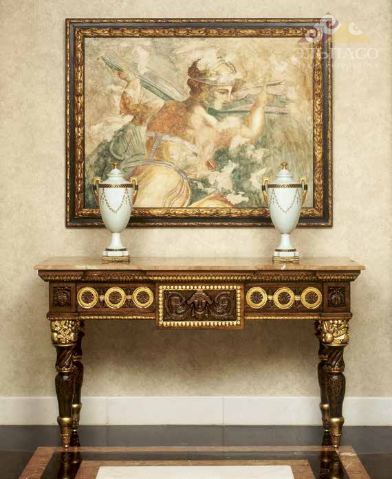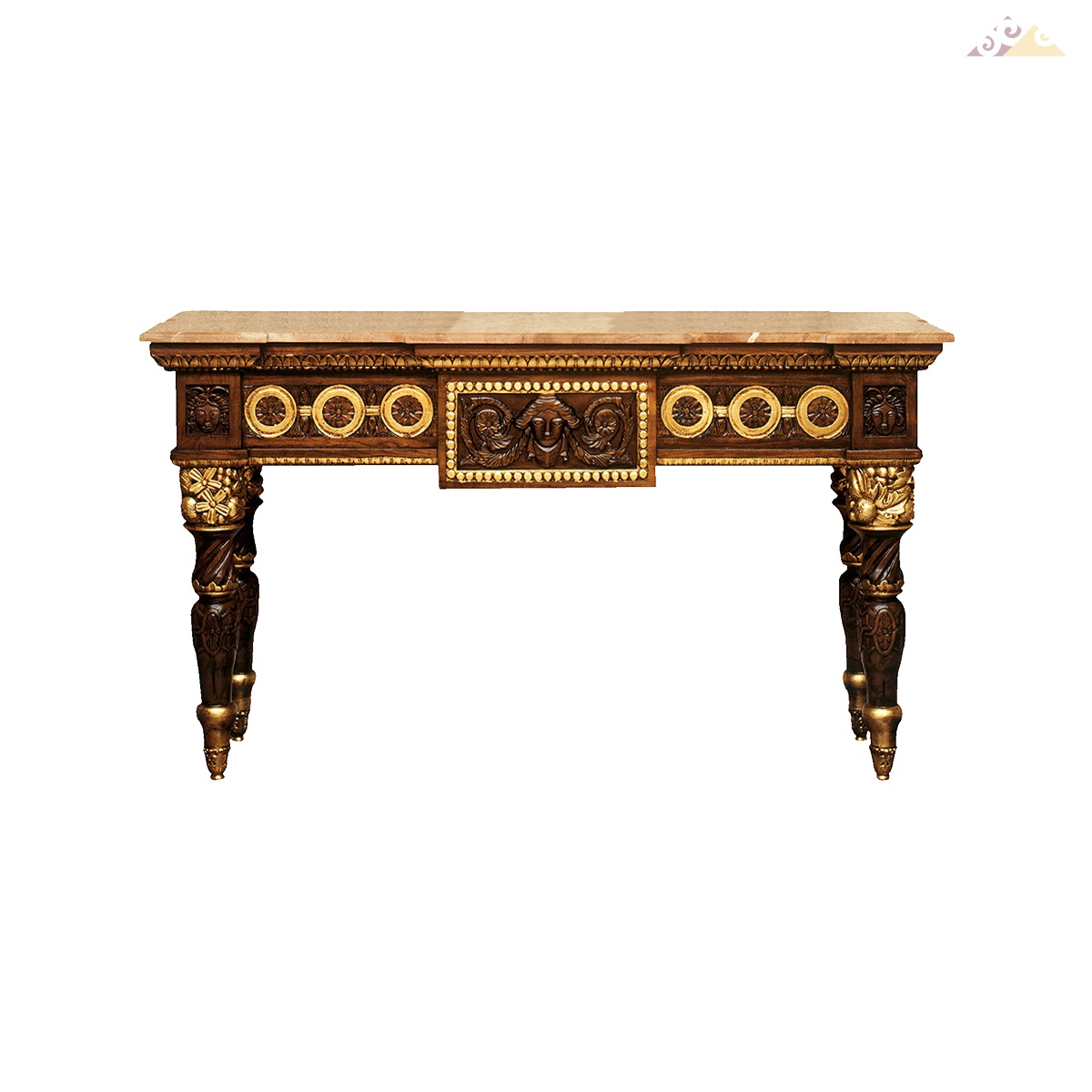 Роскошная консоль с богатым резным декором ручной работы в золоте. Выполнена из массива дерева. Столешница изготовлена из полированного мрамора. Образ истинного великолепия и элегантной роскоши.