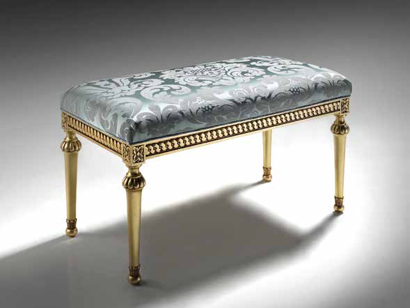 Высота:50 Comfortable bench for the living room, on notched legs. The model is carved from solid wood tinted in a golden shade and decorated with handmade carvings. Upholstered with fabric VERSALLES AGUAMARINA F2242, this chaise longue represents a perfect instance of impeccably made designer furniture. Color palette as per catalog.