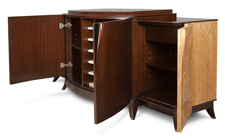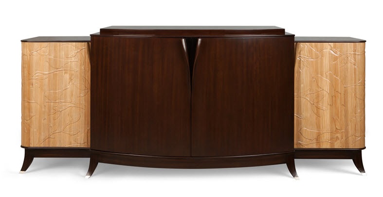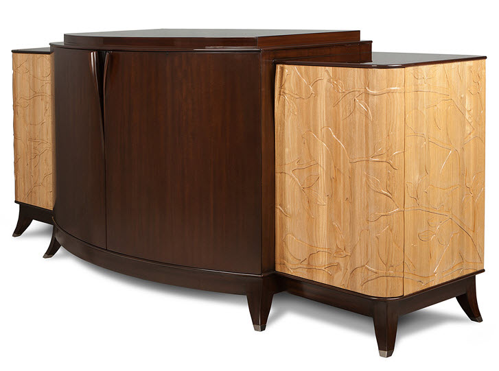 Высота:87 Sumptuous cabinet with unique hand-carved handles and exquisite bas-relief reproducing songbirds. Ideal option for books, cocktails or entertainment equipment. It includes eight spaces for various items and is complemented by two pull-out drawers and 12 cells for wine bottles. Made of mahogany wood.