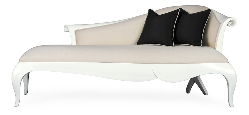 Высота:82 Elegant chaise lounge for the relax area in the living room. Mahogany frame with white lacquer finish. Polished surface decorated with carvings. Light grey thick fabric upholstery.