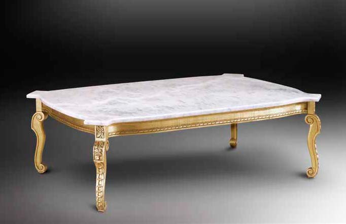 Высота:43 Sumptuous coffee table for the living room, on notched legs. The model is carved from solid wood tinted in a golden shade, decorated with hand-carved floral patterns and scrolls. Topped with white polished marble top, this table has been designed with attention to the tiniest details in terms of functionality and ergonomics. Available in other colors, according to the catalog.