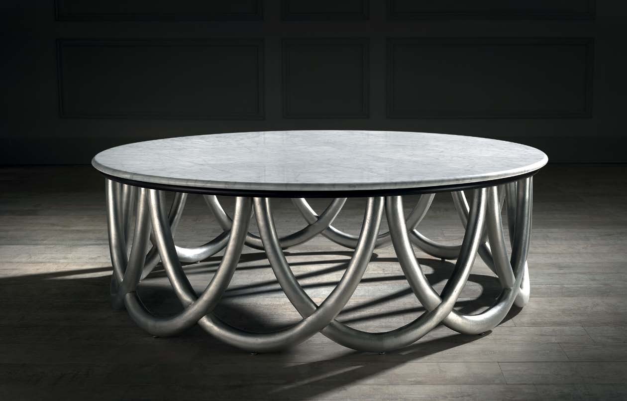 Высота:42 Round coffee table for the living room. The model is carved from solid wood tinted in silver color. High-quality tempered glass top. Perfect instance of impeccably manufactured designer furniture. Available in other colors, according to the manufacturer's catalog.