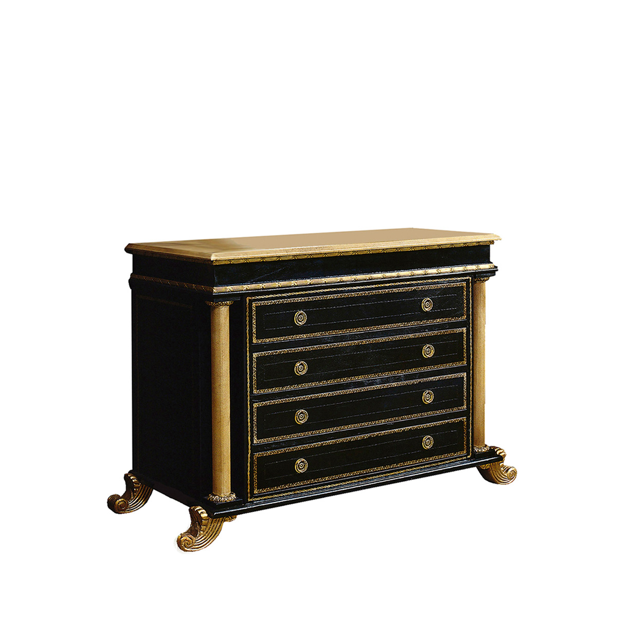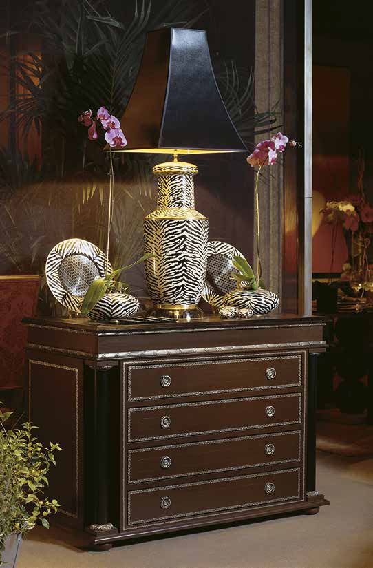 Высота:91 Sumptuous chest of drawers. The model is carved from solid wood, finished with walnut. Decorated with leather and nickel elements, this article represents a perfect instance of impeccably made designer furniture. Color palette as per catalog.