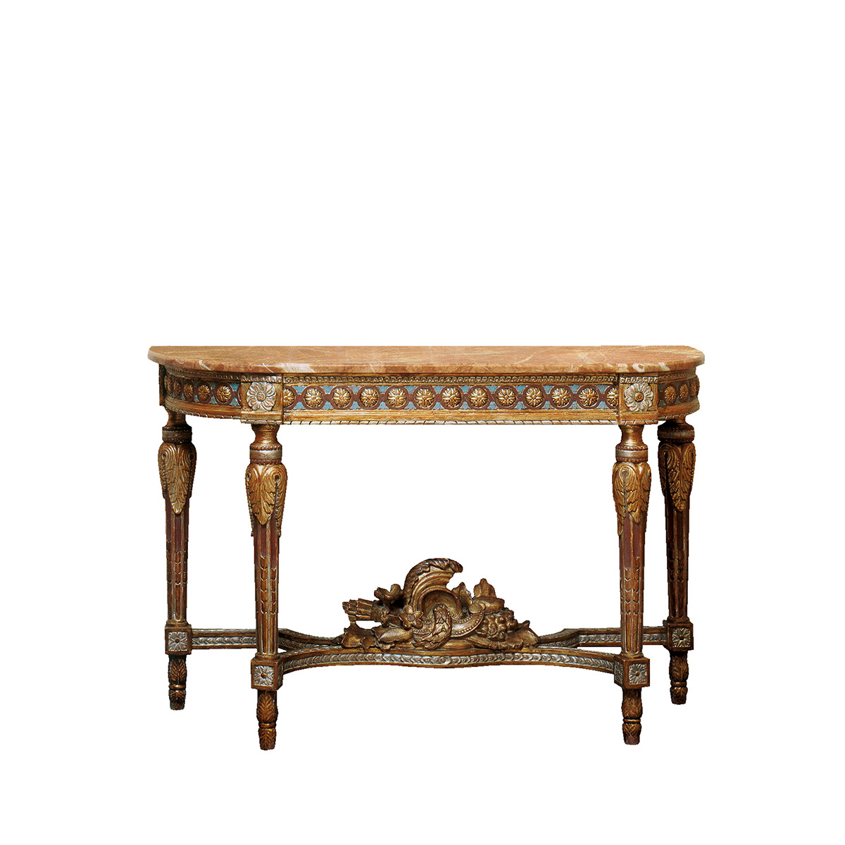 Высота:81 Charming console on notched legs. The model is made of solid wood, decorated with floral patterns and hand-carved scrolls. Topped with sand polished marble, this console represents a perfect instance of impeccably made designer furniture. Color palette as per catalog.