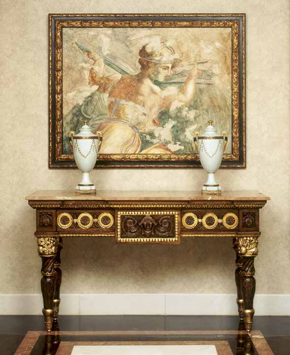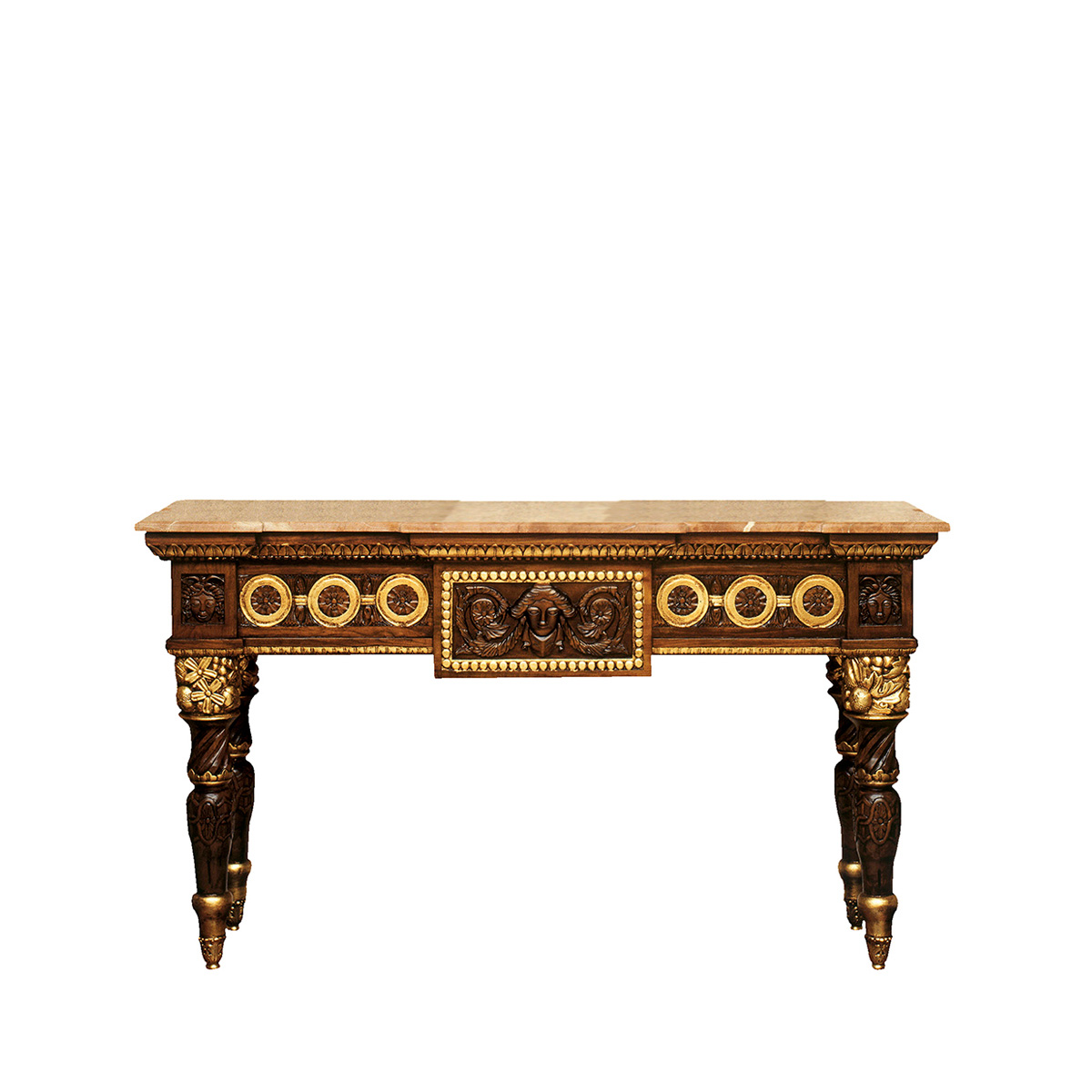 Высота:85 Stylish console on notched legs with drawer. The model is carved from solid wood, finished with walnut. Decorated with floral patterns and hand-carved scrolls. Topped with red polished marble, this console embodies the essence of true elegance and luxury.