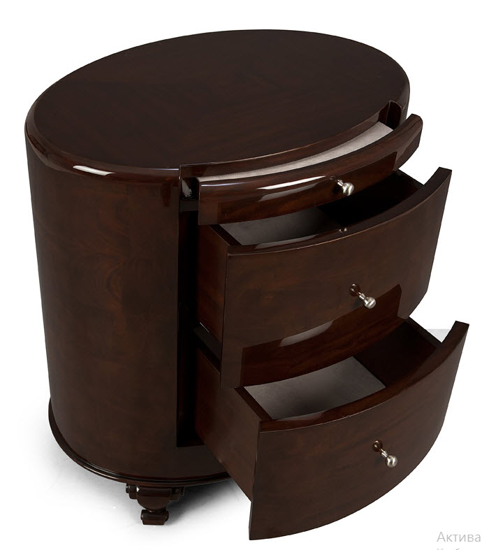 Высота:70 Mahogany bedside table for the bedroom, with a polished and lacquered surface. The model is equipped with two roomy drawers with nubuck leather upholstery for various accessories and a narrow drawer for jewelry. Mature style and functional practicality.