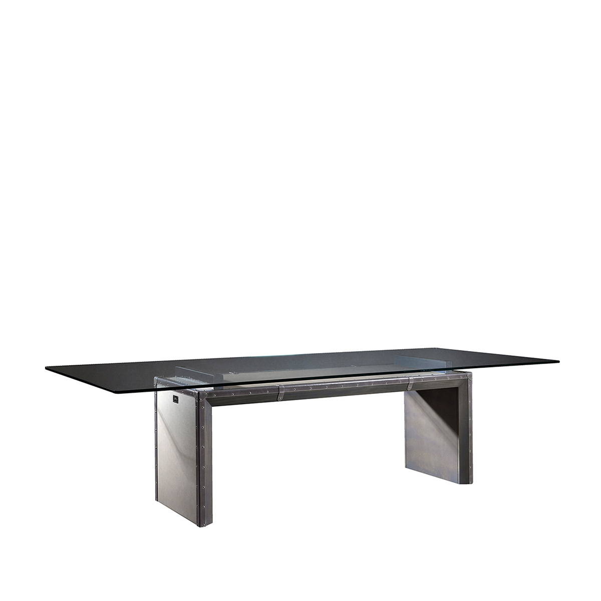 Высота:75 Elegant dining table for the living room, able to enrich and enhance any interior. The base of the model is carved from ood and upholstered with leather Q1011 quilted with straps, metallic studs and pads. The top is made of tempered glass. An instance of perfectly manufactured designer furniture.