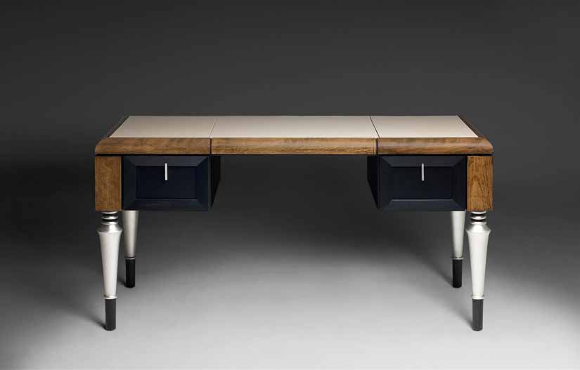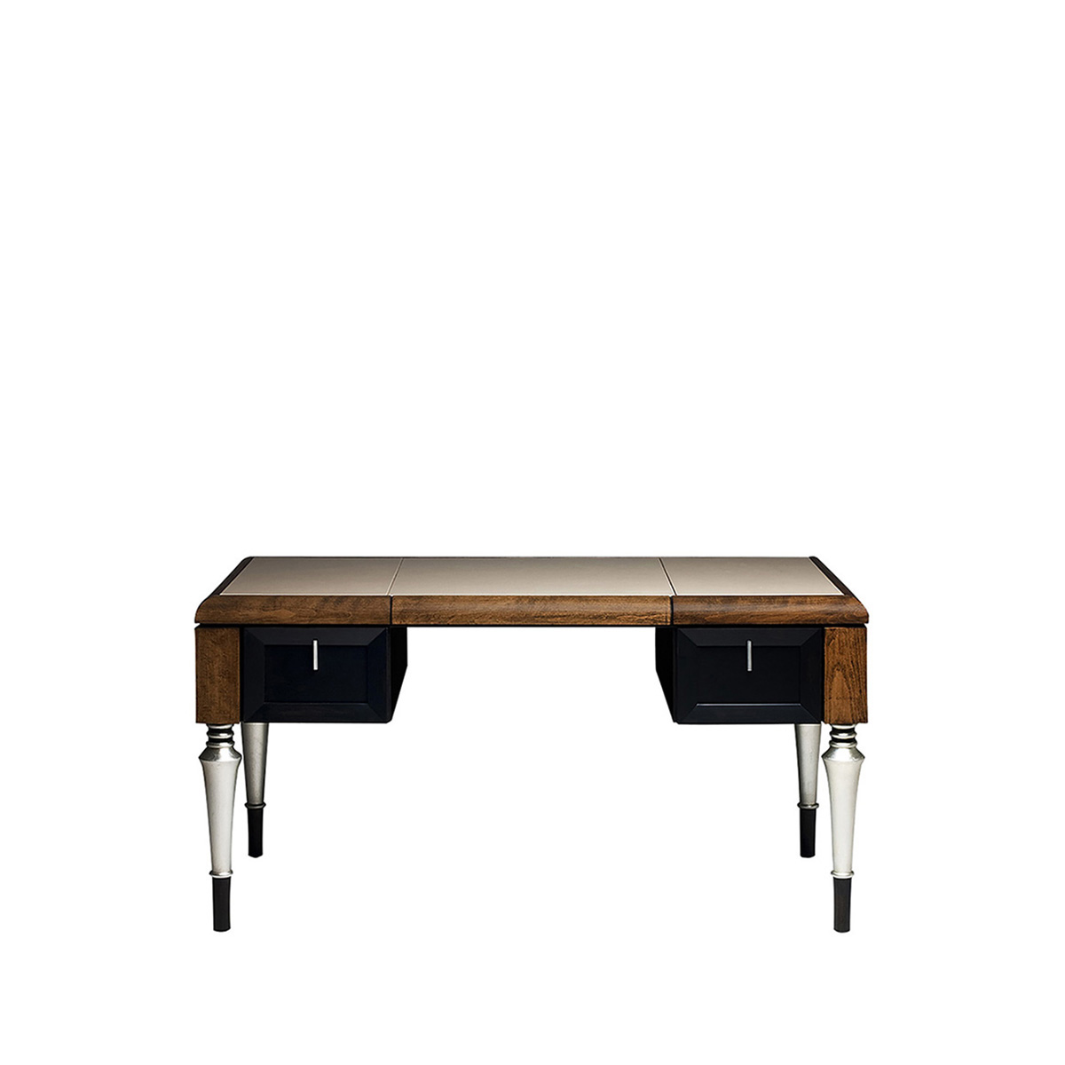 Высота:75 Stylish writing desk on notched legs, with two drawers. The model is carved from solid wood tinted in a brown shade. The top is upholstered with leather L0007. Perfect instance of impeccably made designer furniture. Available in other colors, according to the catalog.