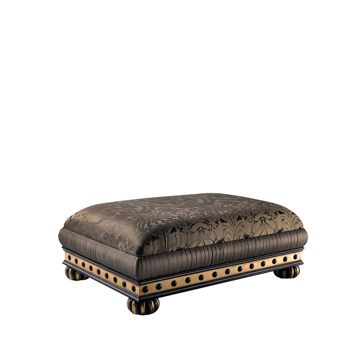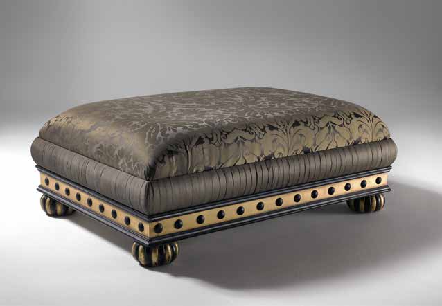Высота:34 Soft puff on notched, gold lacquered legs. The frame is carved from solid wood, upholstered with fabrics TAFETA VERDE BOSQUE and DAMASCO VERDE BOSQUE. This model will enhance any interior. Available in other colors, according to the catalog.