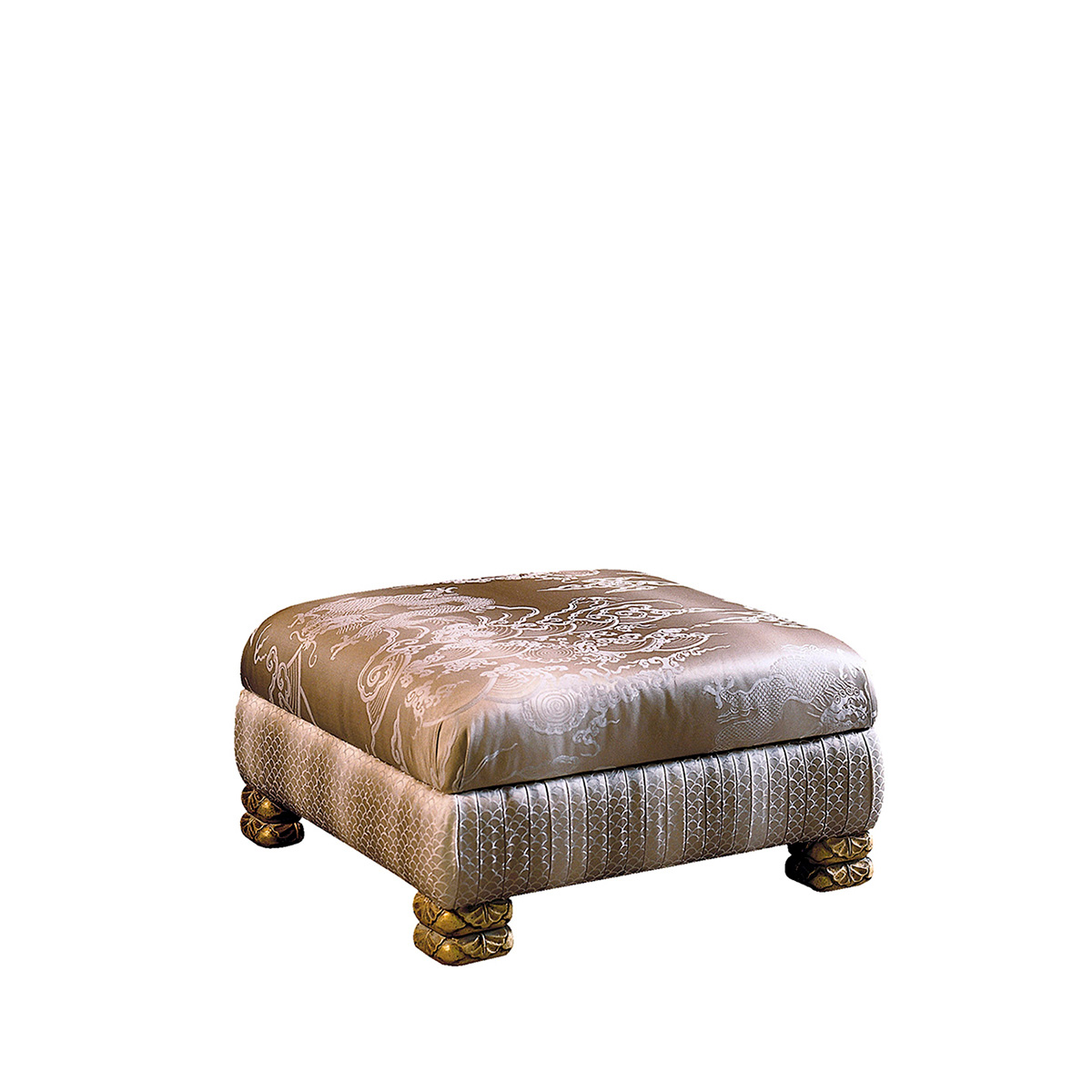 Высота:35 Soft puff on notched, gold lacquered legs. The frame is carved from solid wood, upholstered with fabric YANGTSE MARFIL ORIENTE and ORIENTE MARFIL. Perfect instance of impeccably made designer furniture.
