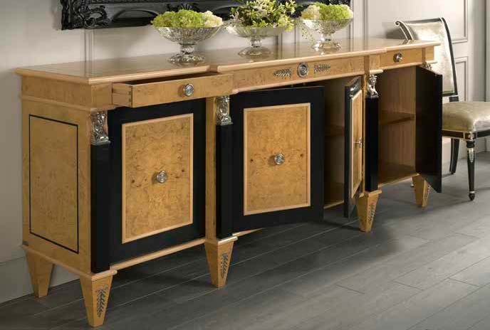 Высота:93 Impressive sideboard with hinged doors and drawers, designed with attention to the tiniest details in terms of functionality and organization of the internal space. Made of solid wood, decorated with hand-carved silver floral patterns. This model represents a perfect instance of impeccably made designer furniture.