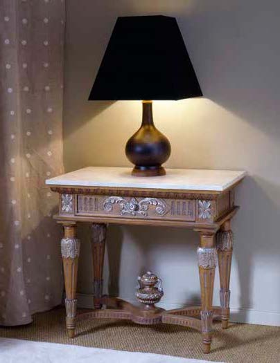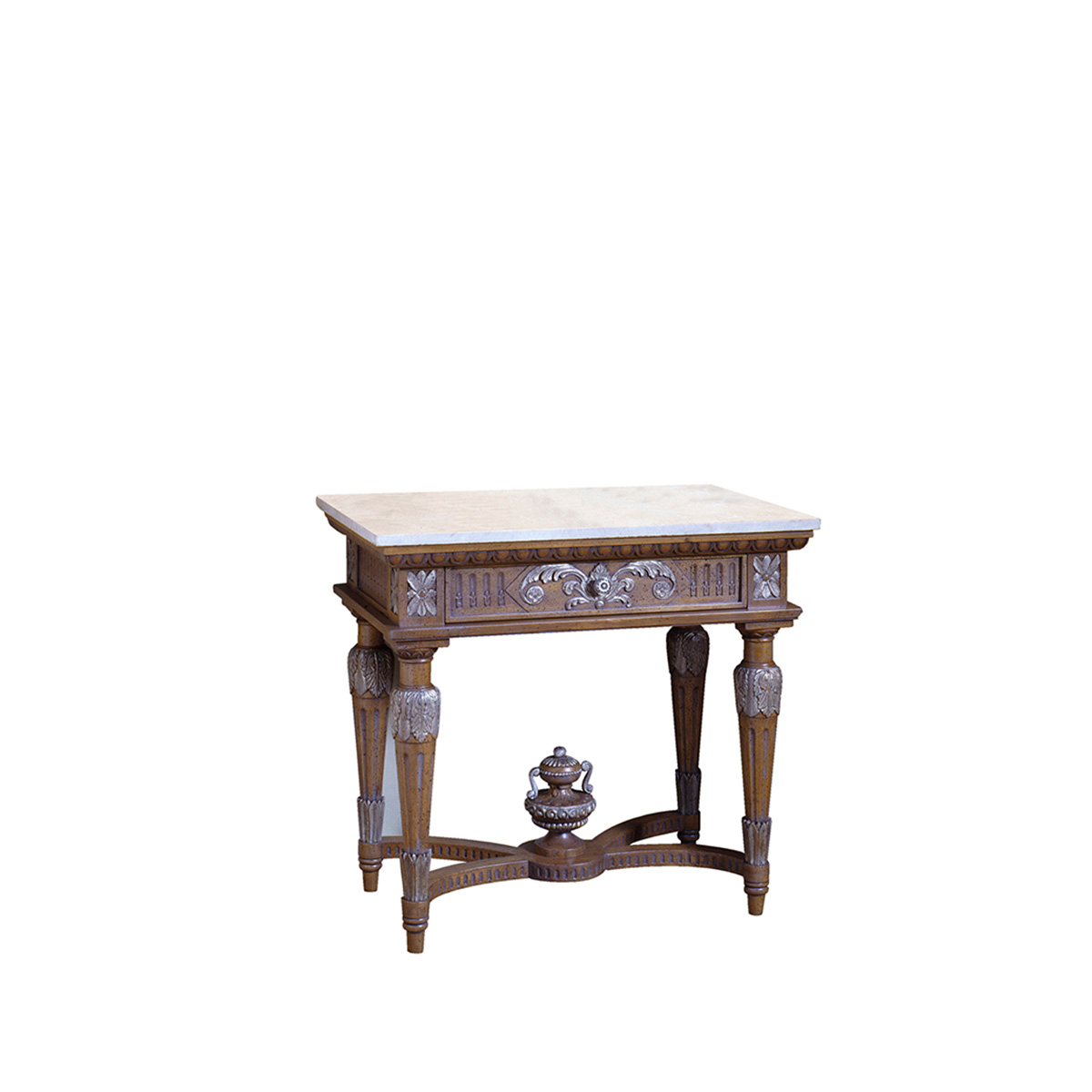 Высота:71 Stylish side table with drawer for the living room, on openwork legs. The model is carved from solid wood tinted in a sand-silver shade, decorated with hand-carved floral patterns and scrolls. Topped with white polished marble, this nighstand will transform and enhance any interior.