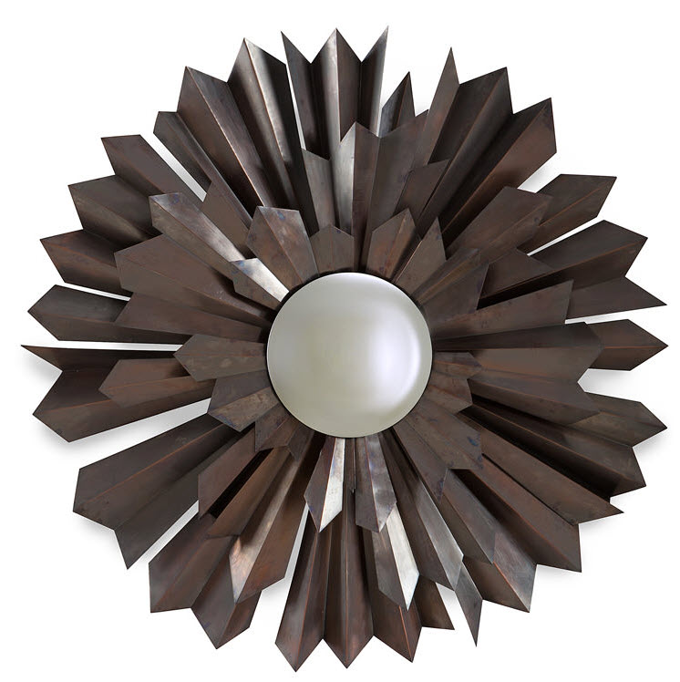 Высота:100 Unique designer mirror for any setting. Made of hand beaten copper. Polished surface. This mirror reproduces overhanging sun-rays, and features a convex shape to create an effect of volume.