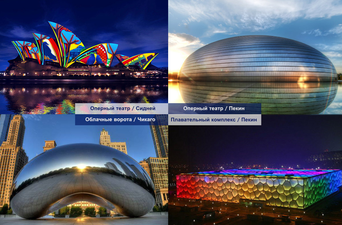 • Плавательный комплекс в Пекине- его конструкция фасада состоит из «пузырьков воды», повторяет кристаллическую решетку, она позволяет аккумулировать солнечную энергию, используемую на нужды здания!