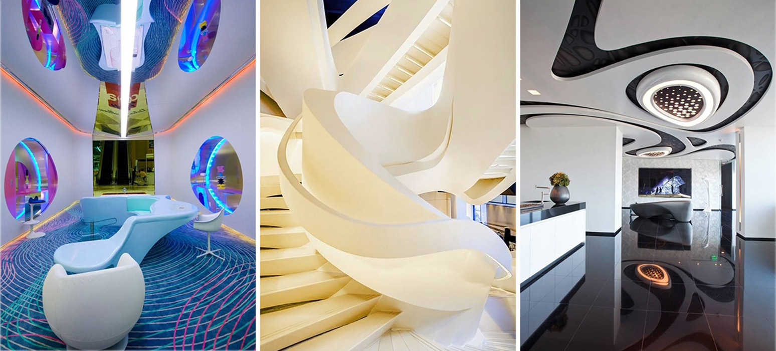 • Гармоничное сочетание фактур и цветов, свойственное живой природе: соты, камни, спирали, наутилусы, лотосы, деревья, поверхности, имитирующие водную гладь, водопады, облака и небесные светила.