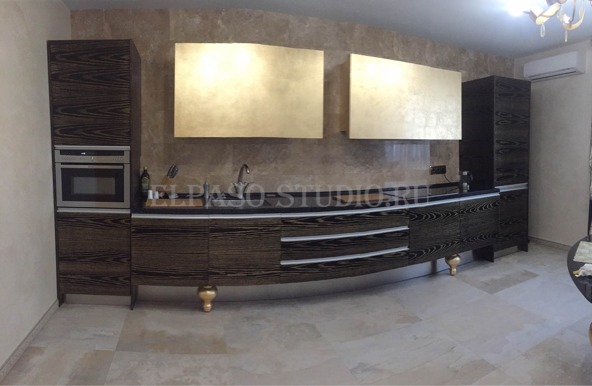 Особенность отделки кухни - чёрный шпон с золотистыми прожилками и оригинальные навесные фасады. Кухня «приподнята» над полом стильными резными ножками, но имеет внутри цоколь, который находится глубже уровня ножек.