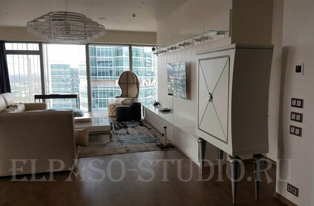 Специалистами компании "Эльпасо" реализован проект для частного интерьера. Мы меблировали апартаменты на 32 этаже с потрясающим панорамным видом на Москву. Это - Бизнес-центр «Башня Москва» - один из двух небоскребов «Города Столиц», входящего в состав Международного Делового Центра "Москва-Сити".