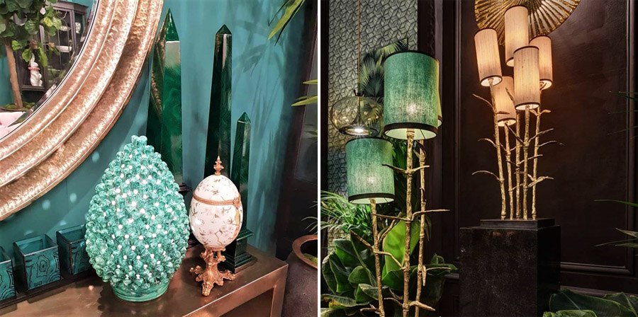 Наша подборка предметов декора в бирюзовых оттенках: стильные бары-комоды со створками двух видов: тропические цветы и обтяжка шкуркой коровы (имитация) цвета лайм в металлических клёпках "пчелиные соты"; природные мотивы соединили с 3D-графикой от Ungaro.