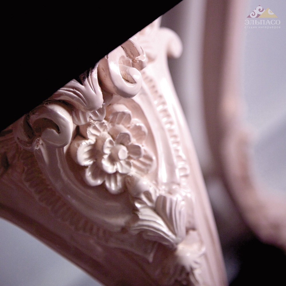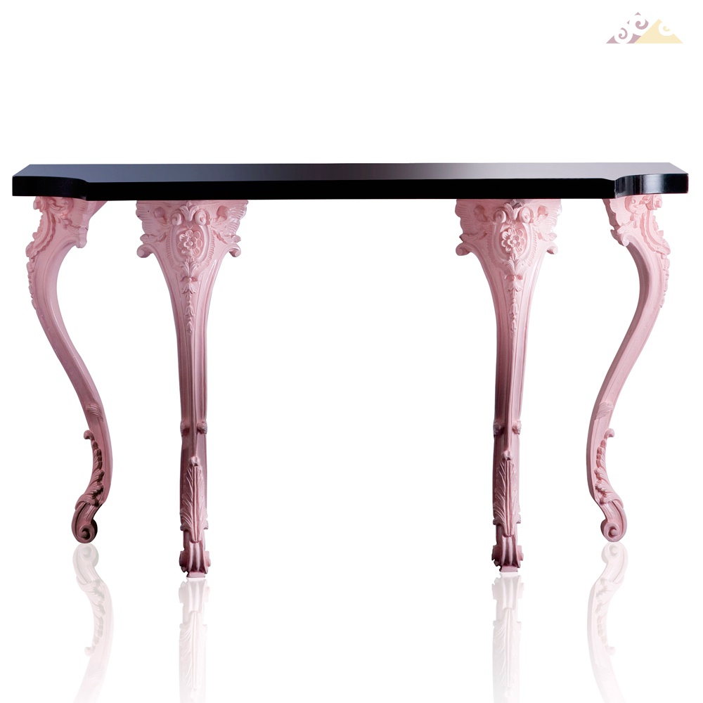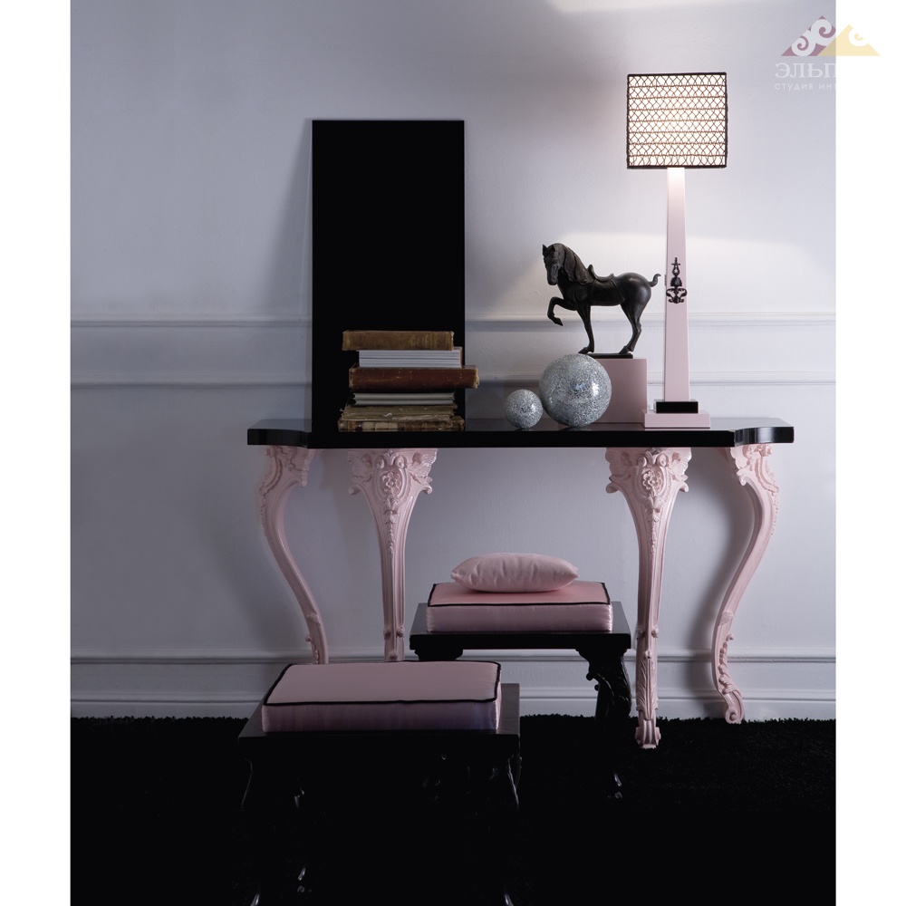 Деревянная консоль на розовых, резных ножках. Черная столешница.