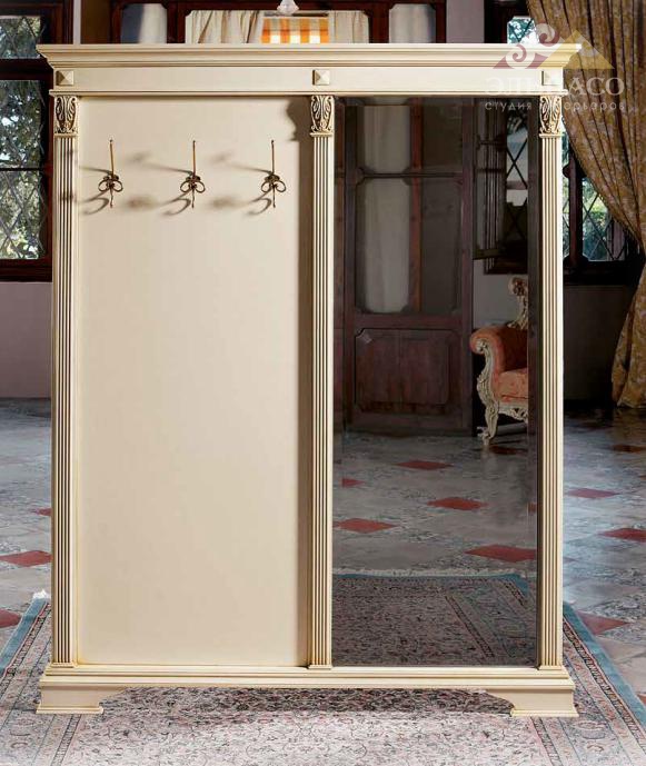 Красивая прихожая с зеркалом. Модель изготовлена из натурального дерева. Поверхности полированные, в отделке античный лак. Применена ручная резьба элементов корпуса, покрытая сусальным золотом. Правая половина прихожей выполнена в виде зеркала. Функциональность, стиль и ежедневная практичность.
