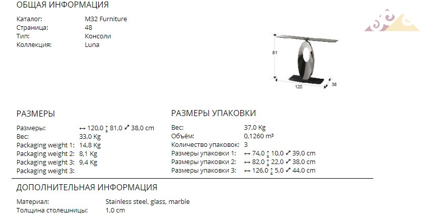 Высота:81 смКонсоль Schuller Luna Art.821268 с основанием из нержавеющей стали на закруглённой мраморной плите. Стеклянная столешница с фаской.