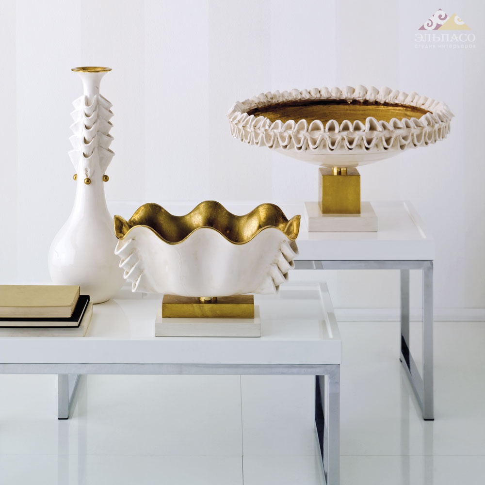 Ваза из майолики с настоящими деталями золота. Глянцево - белая лакированная деревянная основа, c деталями из латуни.