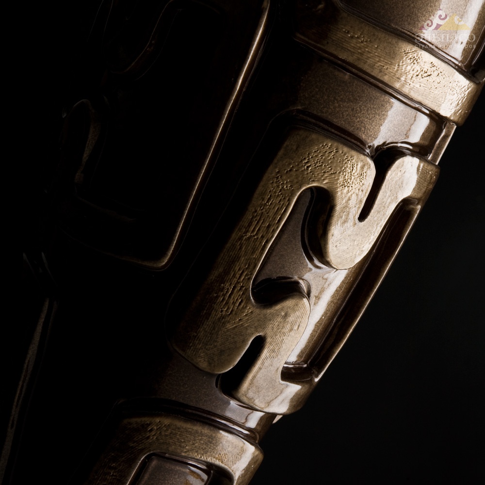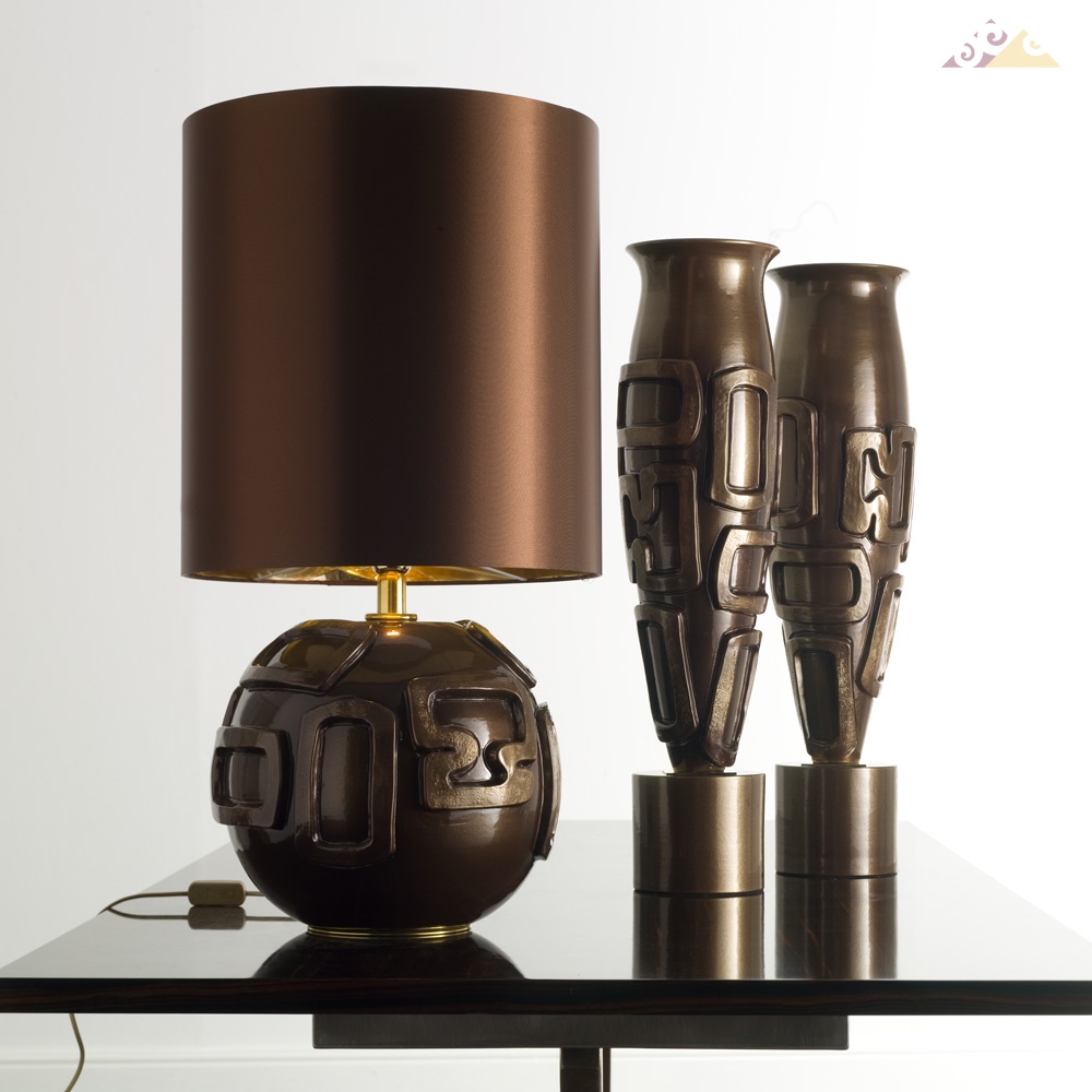 Декоративная ваза из майолики с бронзовым эффектом. Золотая деталь между вазой и основанием.