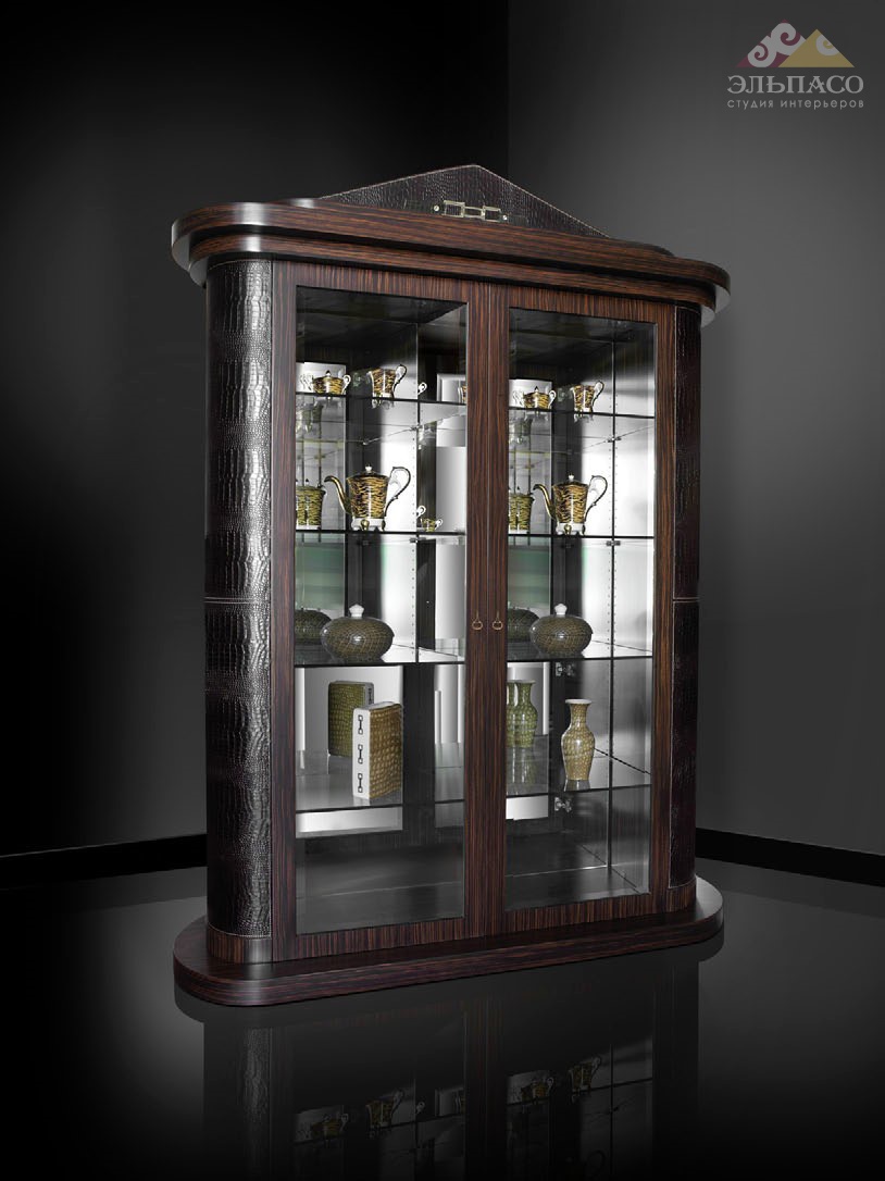 Двойной барный шкаф. Облицован шпоном wengé, инкрустирован стременами. Корпус обтянут высококачественной кожей new cocco tobacco. Шкаф декорирован прямоугольными стременами цвета никеля. Большие стеклянные дверцы и стеклянные полки с подсветкой эффектно подчёркивают стиль.