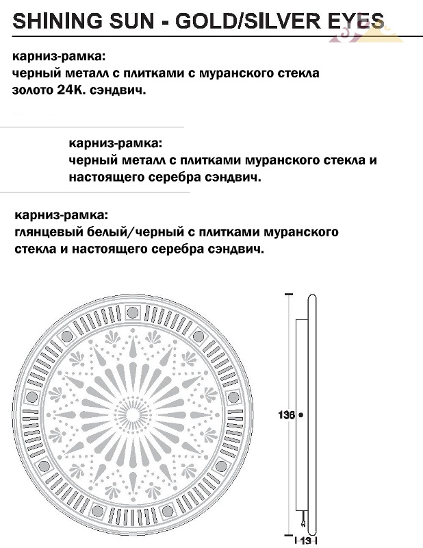 Блестящий настенный светильник круглой формы в виде картины с росписью из уникальной коллекции Gold eyes. Эффектное обрамление в черной отделке со вставками из муранского стекла с добавлением золота 24 кт. Возможны варианты исполнения центральной части в черной или белой гамме. Светильник укомплектован выключателем и вилкой (220В).