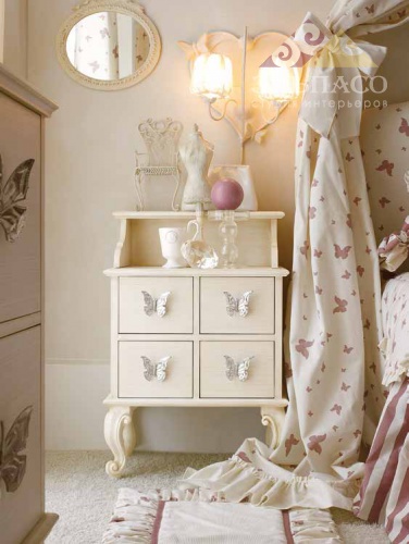 Прикроватная тумбочка на ножках с четырьмя выдвижными ящиками с металлическими ручками в форме бабочек, для детской комнаты из коллекции Carmen.