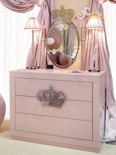 Комод для спальни в стиле арт-деко, с тремя выдвижными ящиками,  розового глянцевого цвета с металлическими ручками в форме короны.