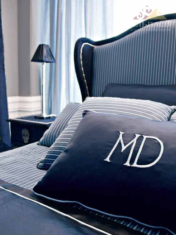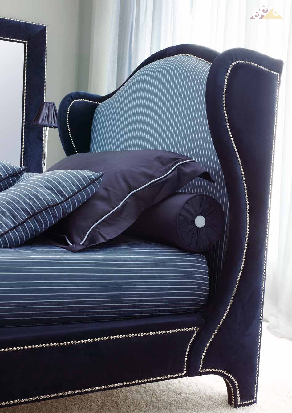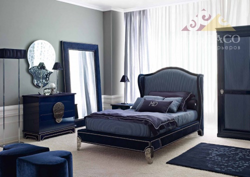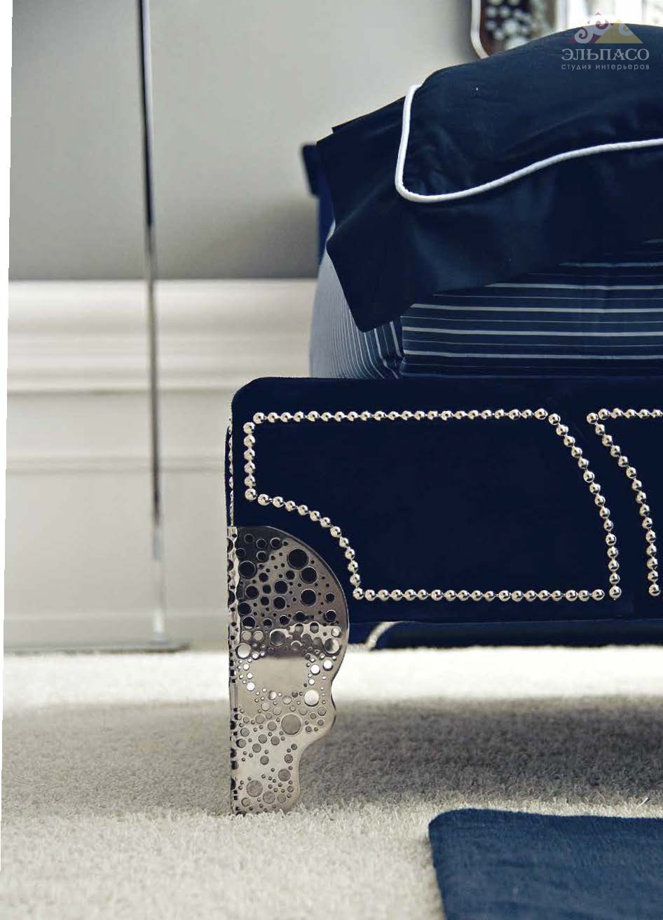 Детская кровать LEONE с клепками и фигурным изголовьем на стальных ножках в форме черепа, в замшевой обивке, в стиле Ар-деко в детскую комнату для мальчика. Доступна в других цветах.