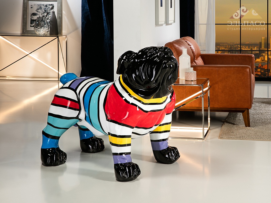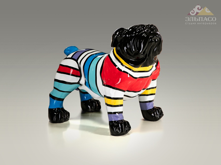 Высота:94 смФигура большого размера, собака породы бульдог, из стеклопластика и полиэстера, декоративные цветные полосы на чёрном фоне.
