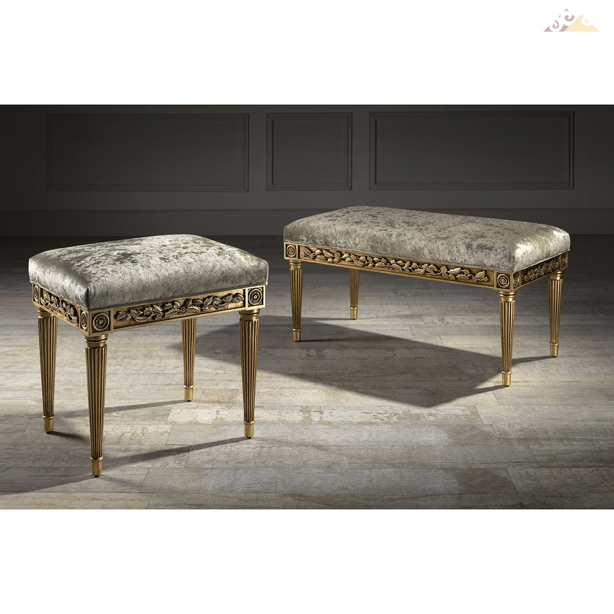 Мягкая банкетка для гостиной на фигурных резных ножках. Модель выполнена из массива дерева тонированного в оттенок античного золота и украшена резьбой ручной работы в золоте. Изделие предлагается в текстильной обивке LE MARAIS CHAMPAGNE F2221. Идеальный вариант безукоризненно выполненной дизайнерской мебели.