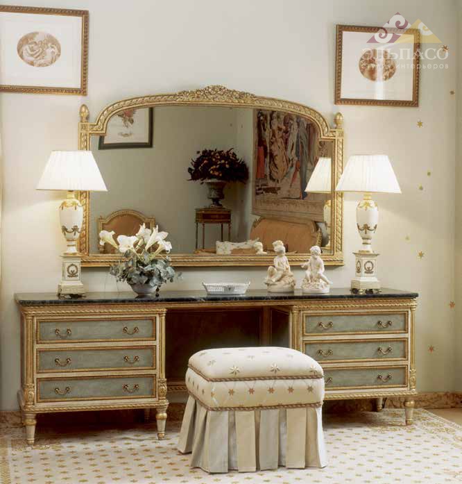 Туалетный столик с 6-тью выдвижными ящиками. Модель выполнена из массива дерева тонированного в бирюзово-золотой оттенок и украшена резьбой с цветочными мотивами в золоте. Столешница изготовлена из полированного мрамора. Идеальный вариант безукоризненно выполненной дизайнерской мебели. Цветовая палитра согласно каталогу компании.