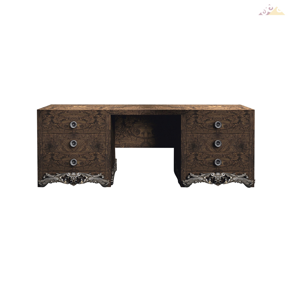 Туалетный столик с 6-тью выдвижными ящиками. Модель выполнена из корня оливы и украшена резными деталями ручной работы в серебре. Идеальный вариант безукоризненно выполненной дизайнерской мебели. Цветовая палитра согласно каталогу компании.