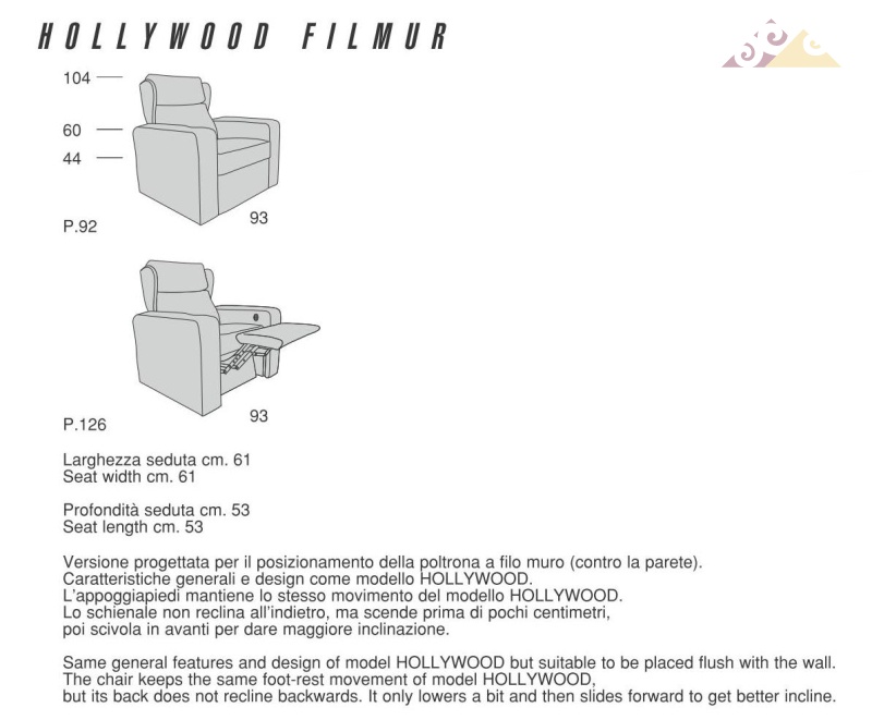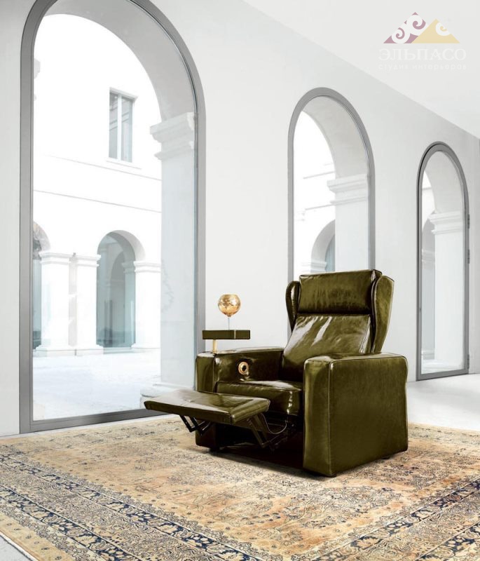 Изысканное релакс-кресло, из уникальной коллекции Hollywood от фабрики Mascheroni, для домашних кинотеатров. Каркас изготовлен из массива дерева и высокопрочной стали. Сиденье и спинка из недеформируемого пенополиуретана с дакроновым покрытием, полностью обтянуты натуральной кожей. Кресло оборудовано электрическим приводом спинки и подножки. Требуемый наклон можно отрегулировать, нажимая кнопку на подлокотнике. Доступно как одно кресло, так и композиций из двух, трех и более сидений. Кнопка электропривода и держатель для чашек выполнены из латуни. По запросу на подлокотник устанавливается поворотный столик. Каждый итальянский ручной продукт Mascheroni отмечен пластиной с выгравированной маркой «Mascheroni srl Made in Italy», которая подтверждает ее подлинность.