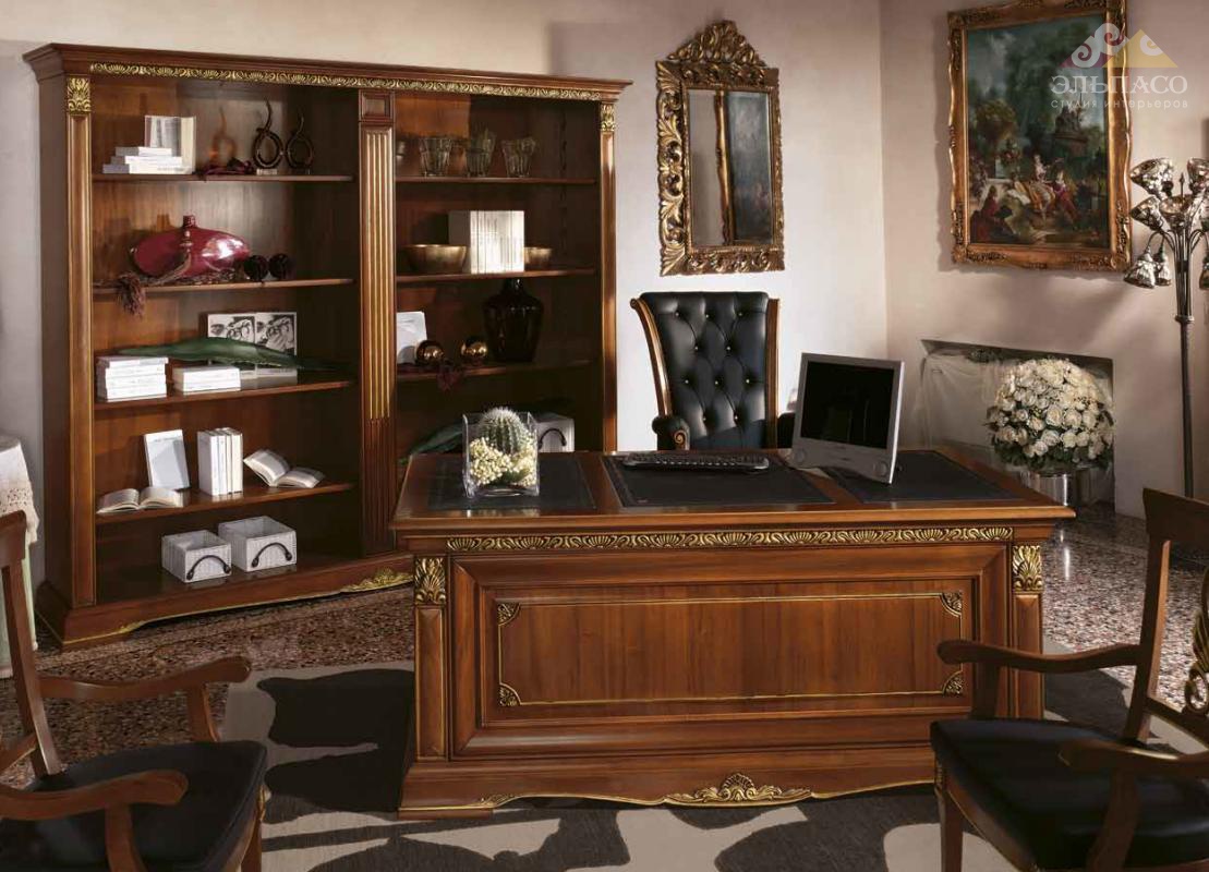 Величественный письменный стол с четырьмя выдвижными ящиками. Модель изготовлена из натурального дерева. Поверхности полированные, в отделке вишня, покрыты состаренным лаком. Применена ручная резьба поверхностей стола, покрытая золотой фольгой. Столешница отделана натуральной кожей.