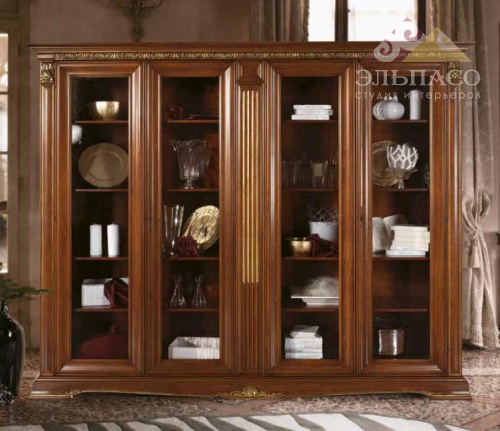 Шикарная витрина с четырьмя распашными дверцами. Модель изготовлена из натурального дерева. Поверхности полированные, в отделке вишня, покрыты состаренным лаком. Применена ручная резьба элементов фасада, покрытая золотой фольгой. Передние двери выполнены из стекла в деревянной раме.