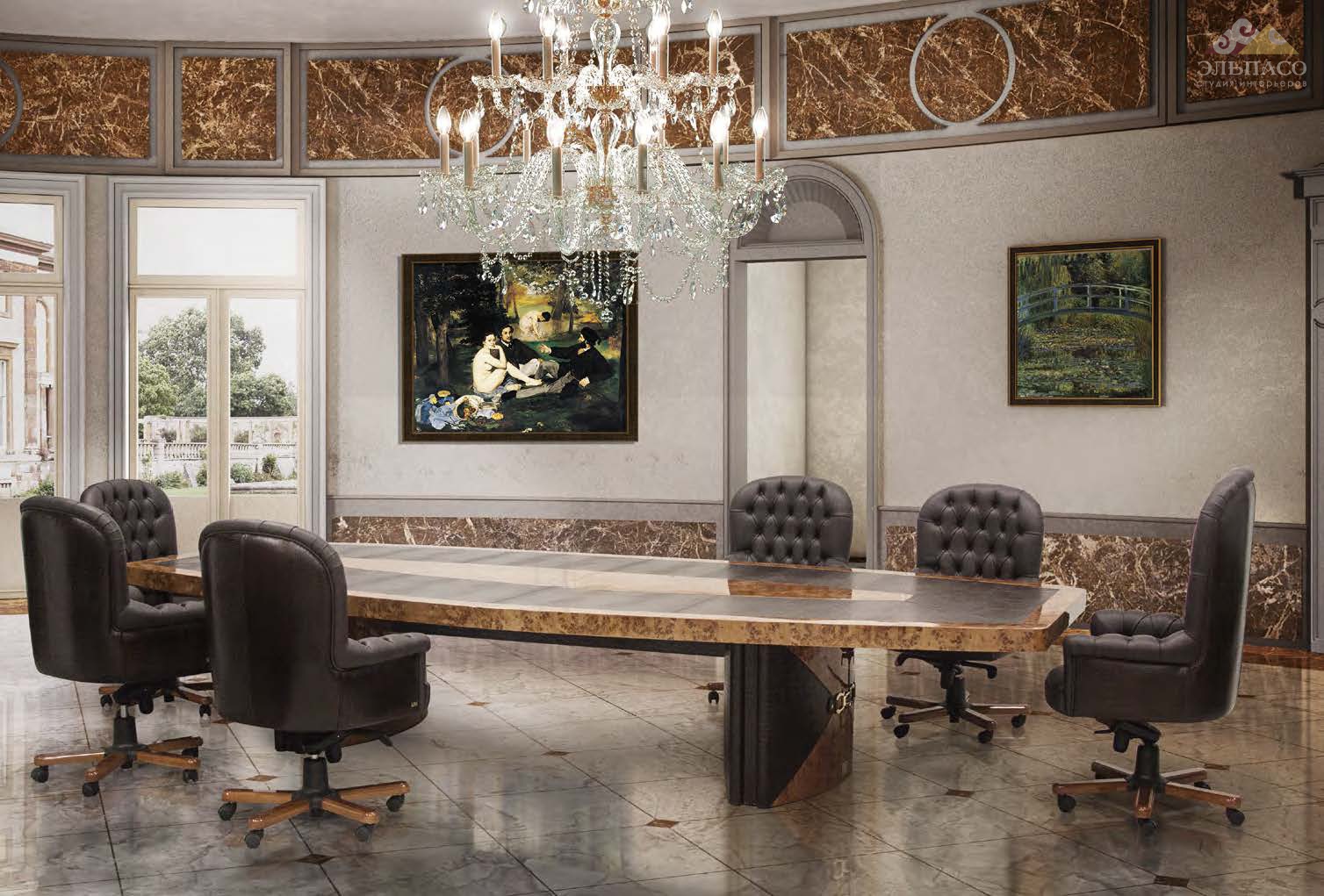 Конференц-стол для офиса. Изготовлено из фанеры тополя цвета коньяка, глянцевый. Кожа cocco miss tobacco, овальные стремена окрашены в золотой цвет.