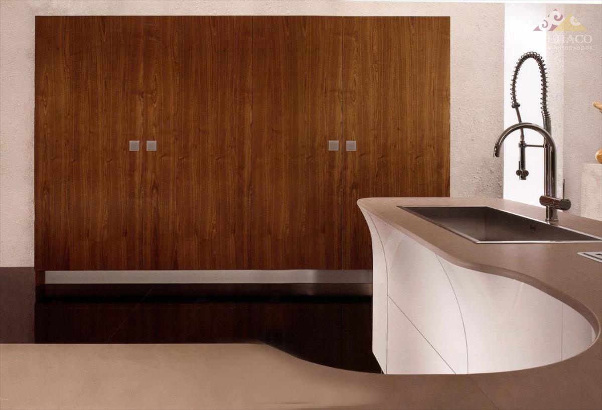 В качестве материала для столешницы, декоративных панелей и мойки может использоваться натуральный камень с оригинальной природной текстурой.
