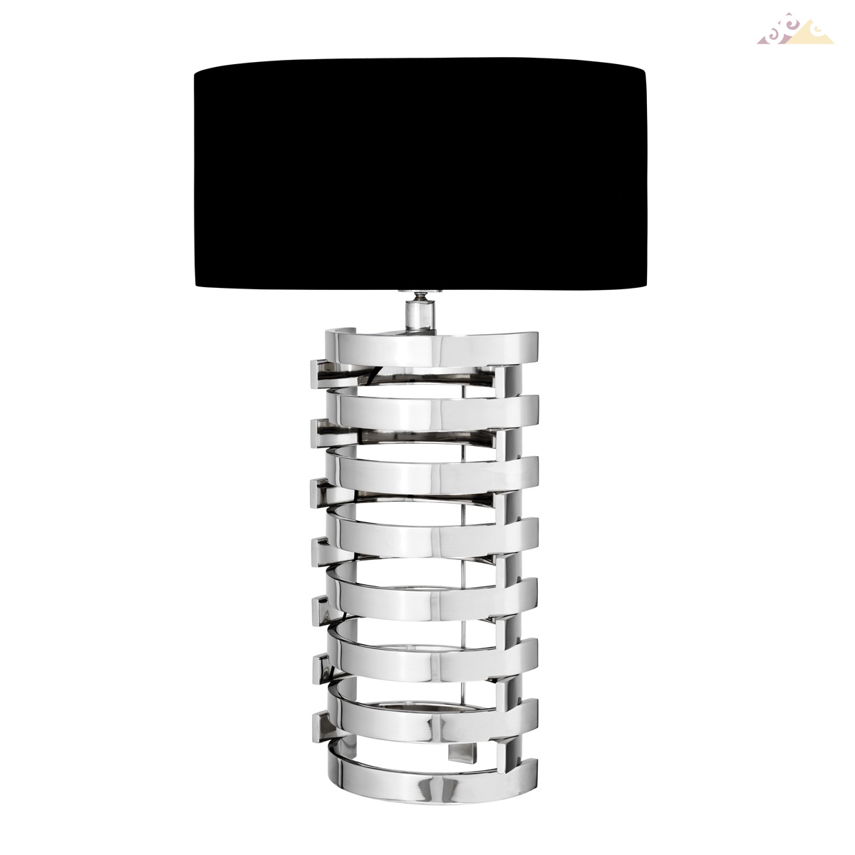 Настольная лампа Boxter L на основании из металла серебряного цвета с оригинальным дизайном в геометрическом стиле. Текстильный абажур чёрного цвета.