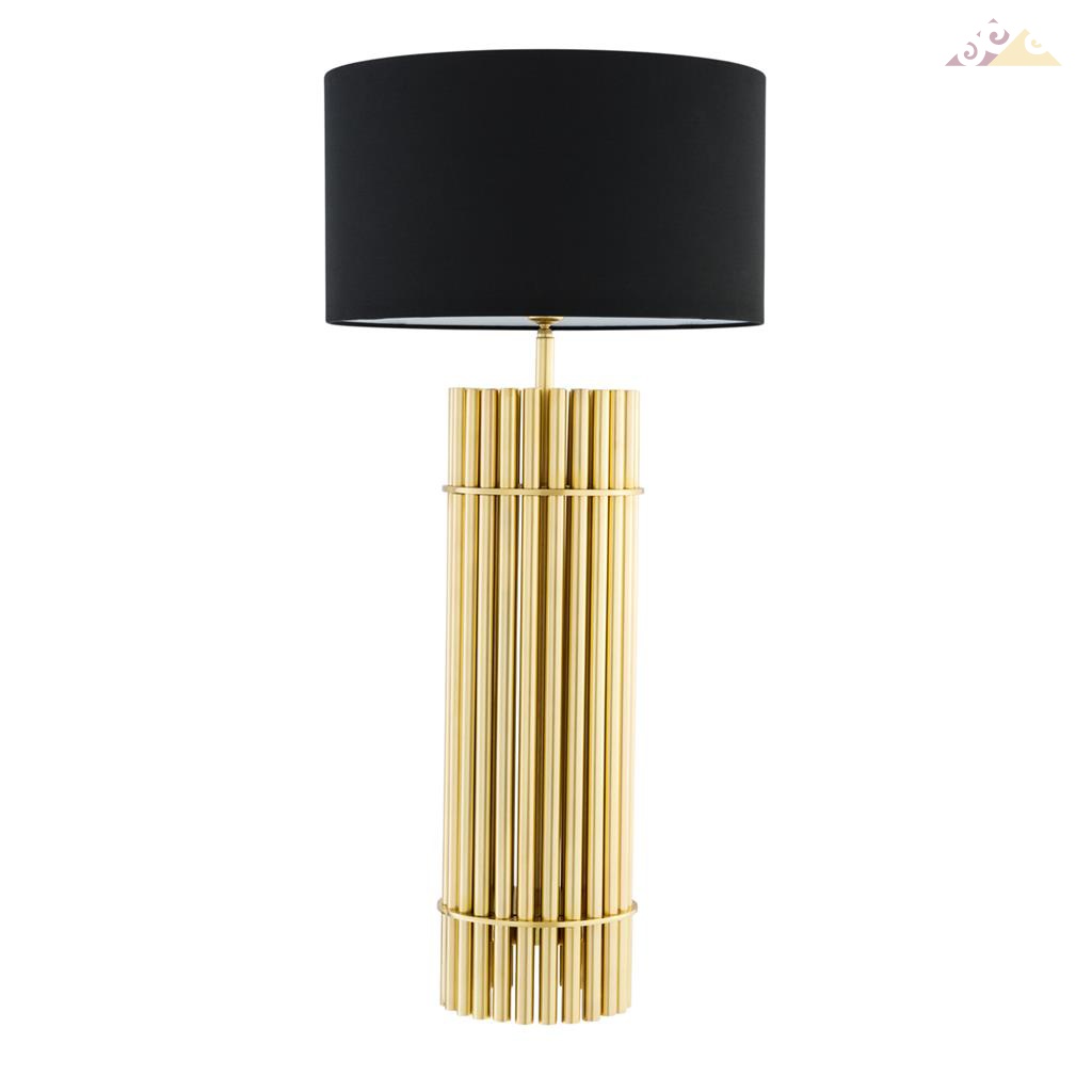 Настольная лампа Reef в современном стиле, на основании из нержавеющей стали золотого цвета. Текстильный абажур чёрного цвета.