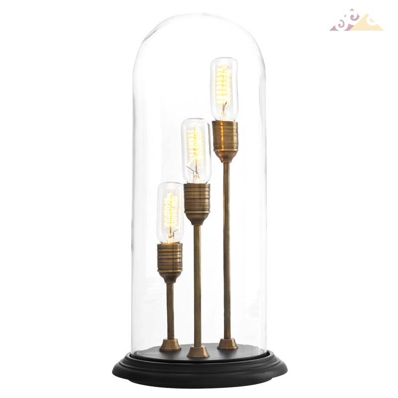 Настольная лампа Spance в стиле Лофт с основанием чёрного цвета. Три стойки-оснований разной высоты из металла, с латунной отделкой помещены в форму из прозрачного стекла.