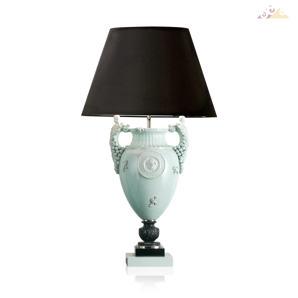 Лампа из майолики с хромированными деталями из латуни. Лакированная деревянная база. Черный абажур с золотом внутри. 1xE27 60W Вес: 6,50 кг