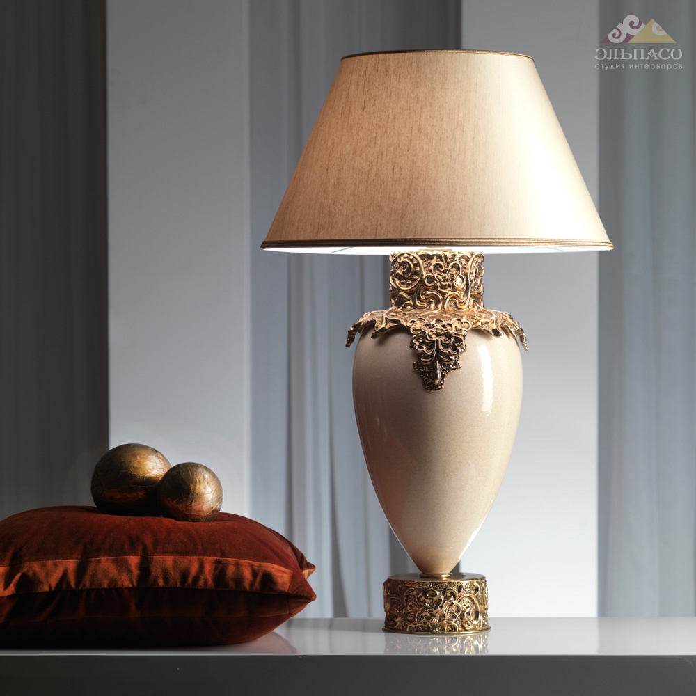 Лампа из майолики с позолоченным декорам, ручная работа. Абажур цвета слоновой кости. 1xE27 60W Вес: 6,50 кг