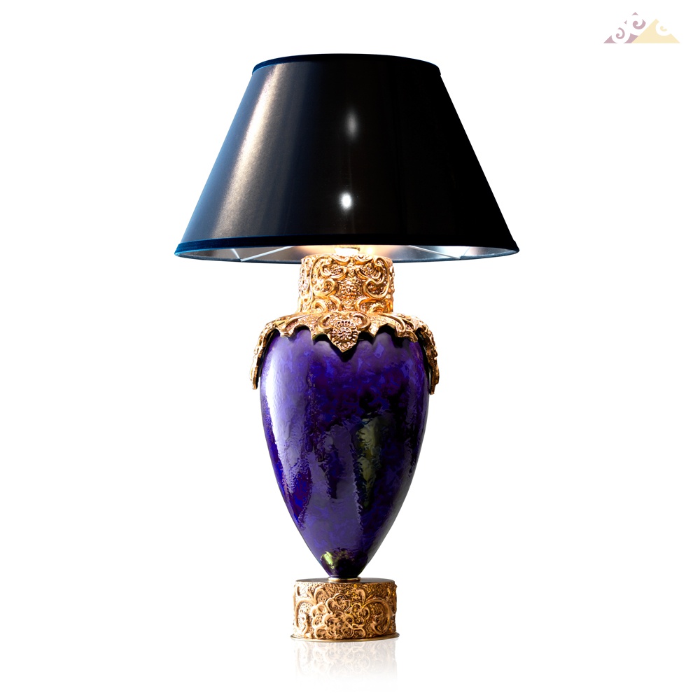 Лампа из майолики с позолоченным декорам, ручная работа. Синий абажур. 1xE27 60W Вес: 6,50 кг