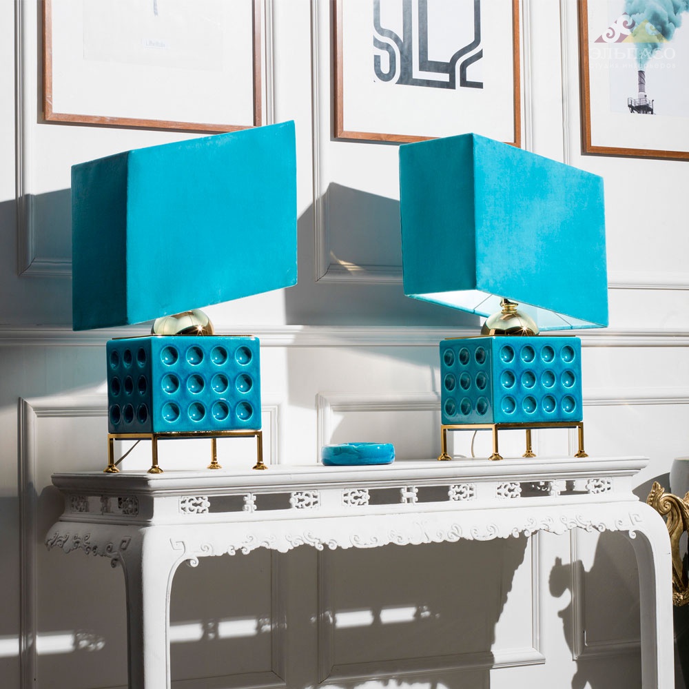 Лампа из майолики в платине, матовые латунные детали. Бархатный абажур. 1xE27 60W Вес: 8 кг